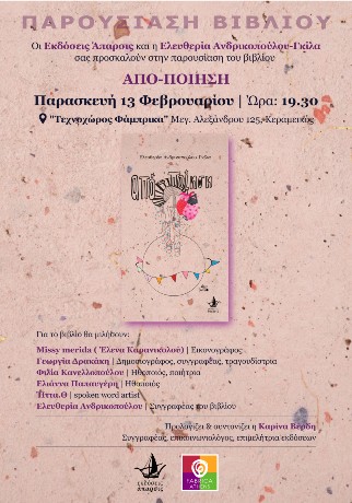Η πρώτη ποιητική συλλογή της Ελευθερίας Ανδρικοπούλου-Γκίλα "ΑΠΟ-ΠΟΙΗΣΗ" που κυκλοφορεί από τις Εκδόσεις Άπαρσις, θα παρουσιαστεί την Παρασκευή 13 Φεβρουαρίου και ώρα 19:30 στον Τεχνοχώρο Φάμπρικα στον Κεραμεικό. Καλή επιτυχία!