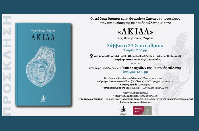Το Σάββατο 27 Σεπτεμβρίου θα γίνει παρουσίαση της ποιητικής συλλογής "Ακίδα" της Φραγκίσκας Ζάρπα στο Apollo Resort Art Hotel. Το βιβλίο κυκλοφορεί από τις εκδόσεις Άπαρσις!